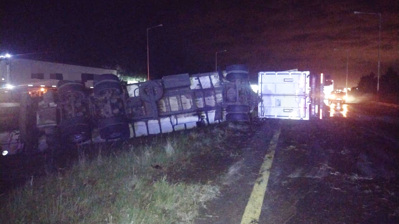 Durante la madrugada de este sábado, en el Kilómetro 244 de la Ruta nacional 14, personal policial de la comisaría de colonia Yeruá intervino en un incidente vial que involucró el vuelco de un camión Iveco 440 de color amarillo, el cual transportaba cajones de pollo congelado.
